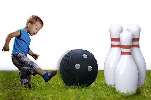 It's the type of game that can be enjoyed by adults & kids. For kids it is great because its easy to setup and can be so much fun! When they actually get to hit the Bowling Pins as they are really large (It's kinda hard to miss them) the ball is light weight so it will be easy enjoyable and great fun. As for the adults it can be a great game for a get together with the family just to let loose and laugh. The Kleeger Giant Inflatable Bowling Set can be a smart edition to your collection of games, or perhaps a great gift idea. The Durable PVC will last for years of play, indoors or out. Includes 6 pins (28" each) and 1 ball (25"Dia).